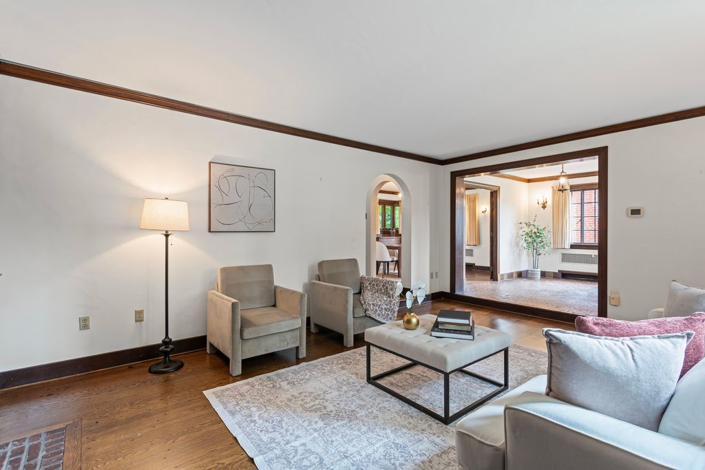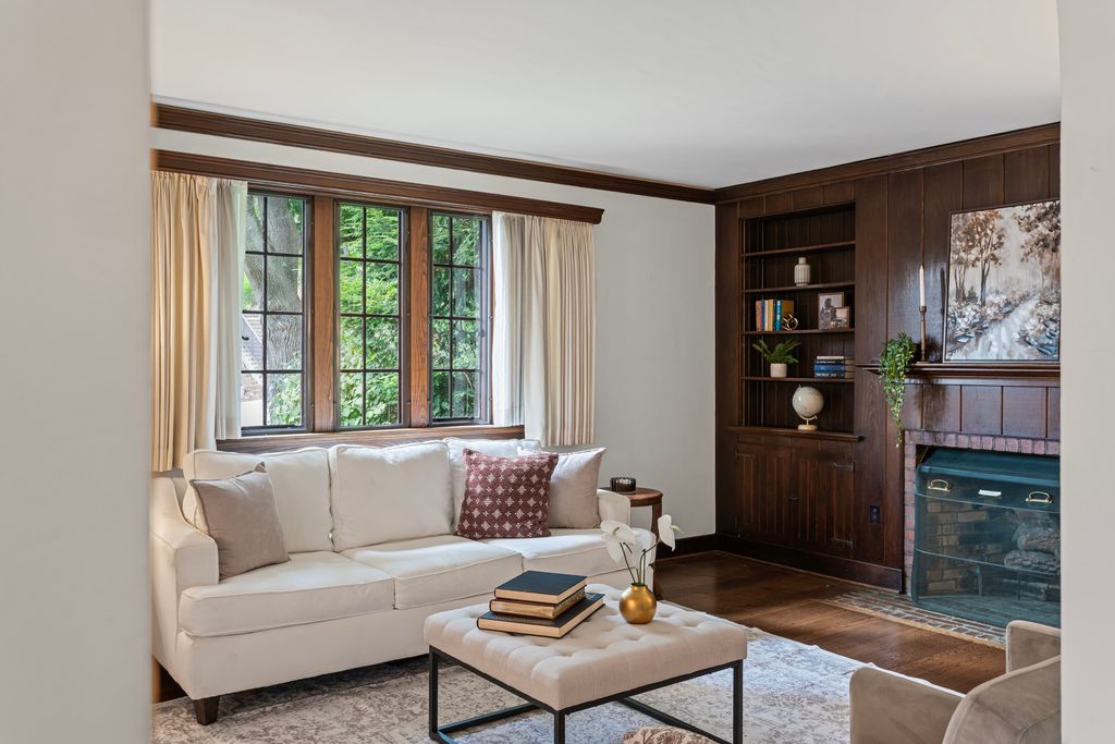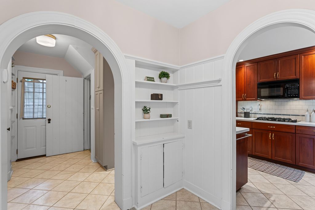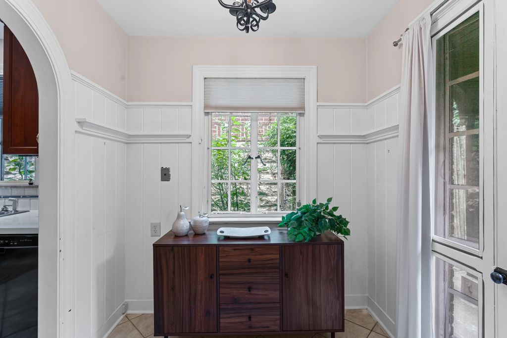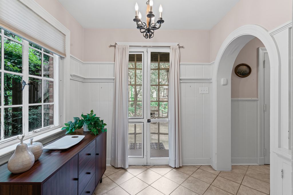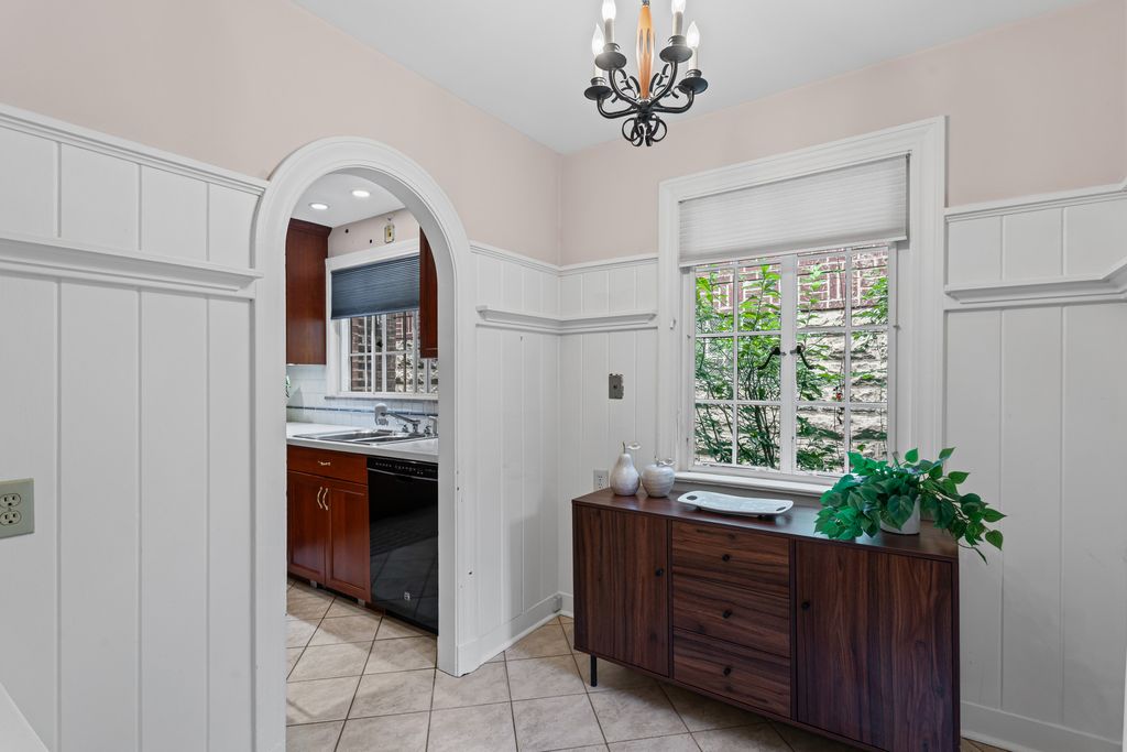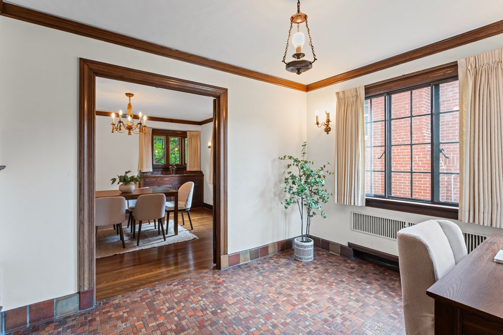 Inside, it’s a home that speaks softly but with presence. Arched wood doorways and curved millwork guide you through rooms filled with natural light and purpose. Hardwood floors stretch beneath your feet, while leaded glass windows and mosaic-tiled details reflect the care of another era. The living room, anchored by a decorative fireplace and built-in bookshelves, opens through French doors to a formal dining room—perfect for gathering, or simply lingering in quiet.