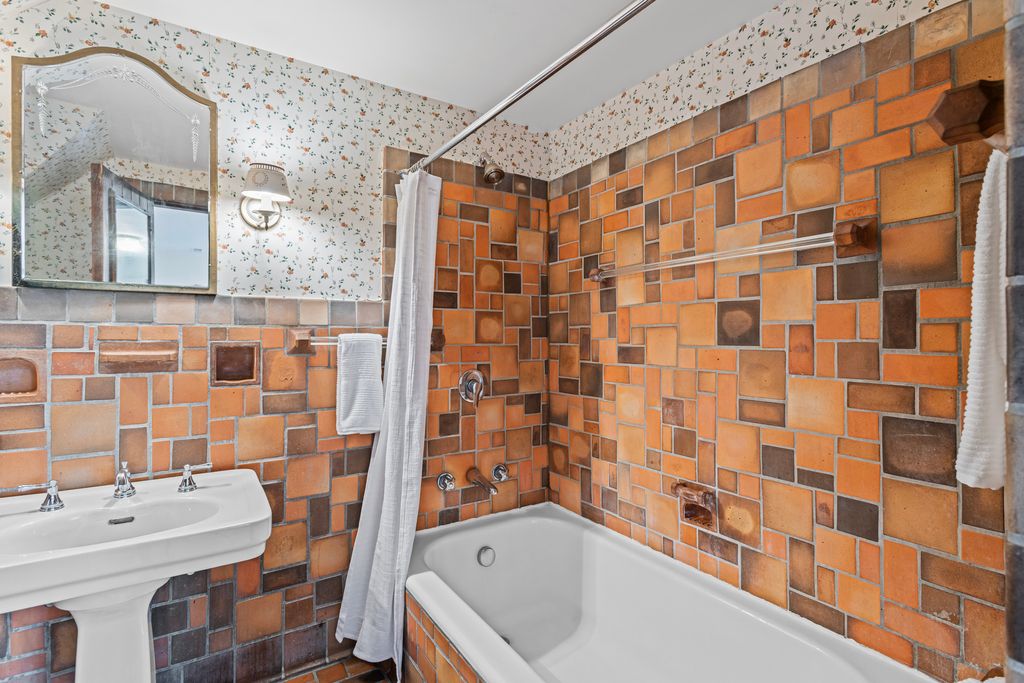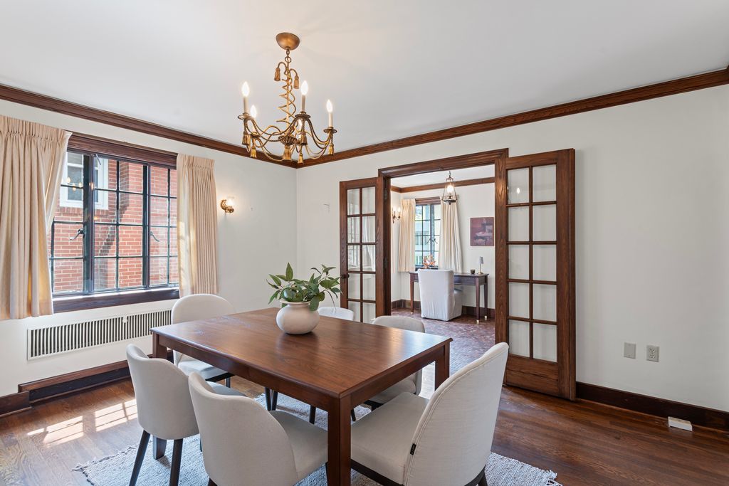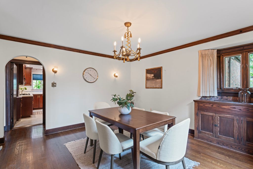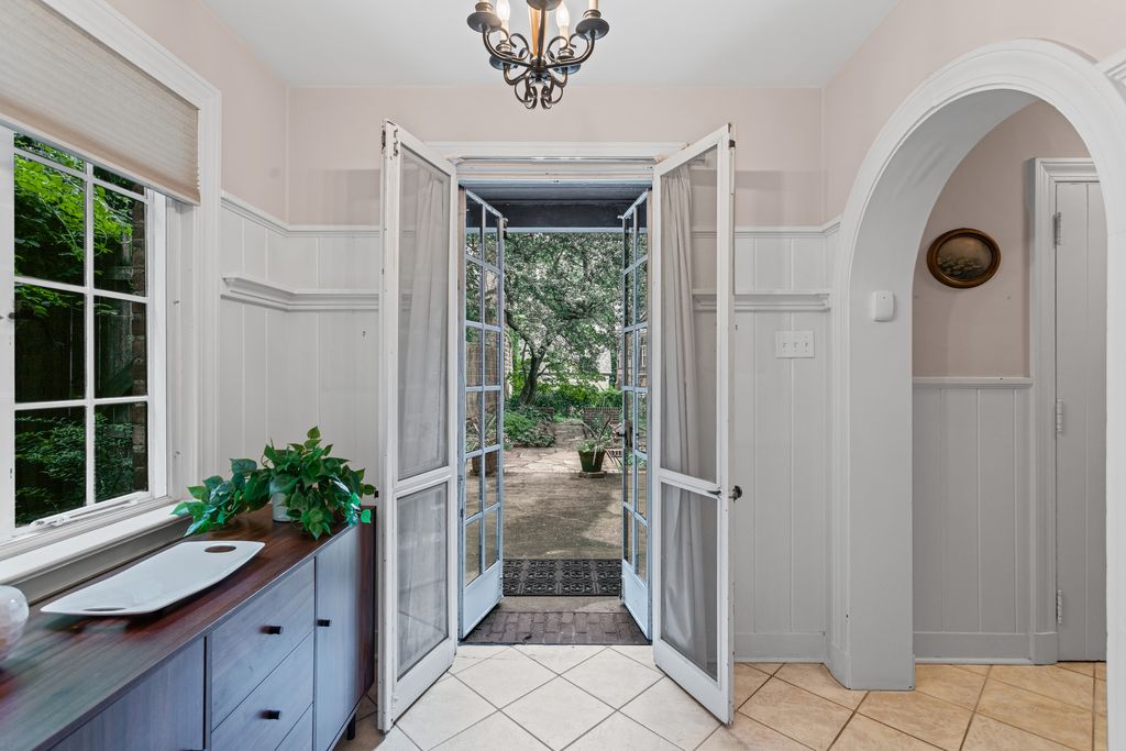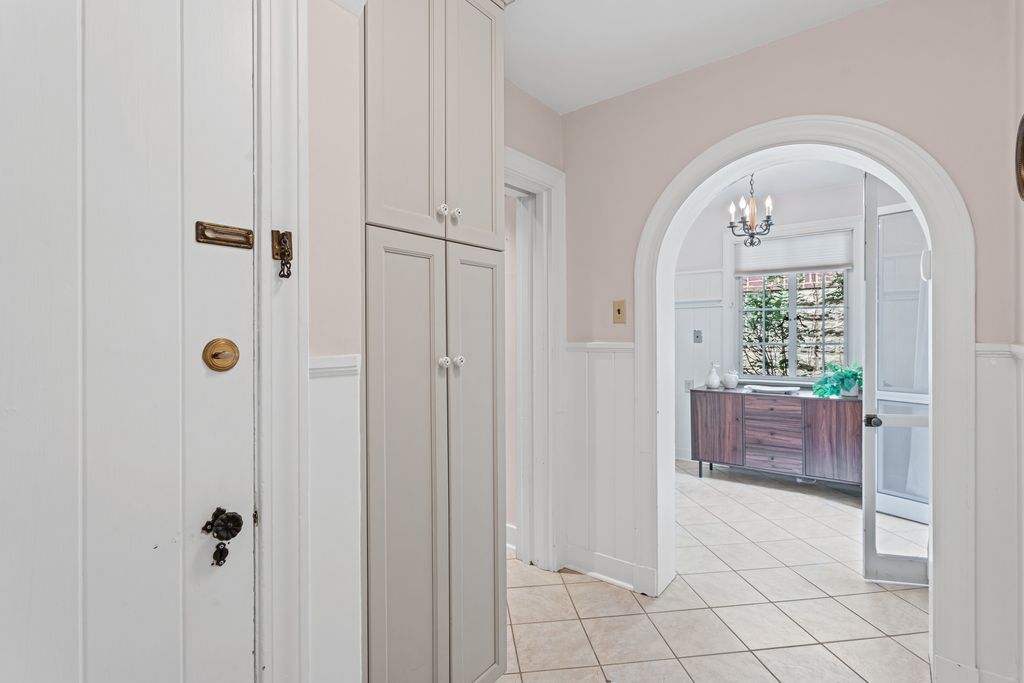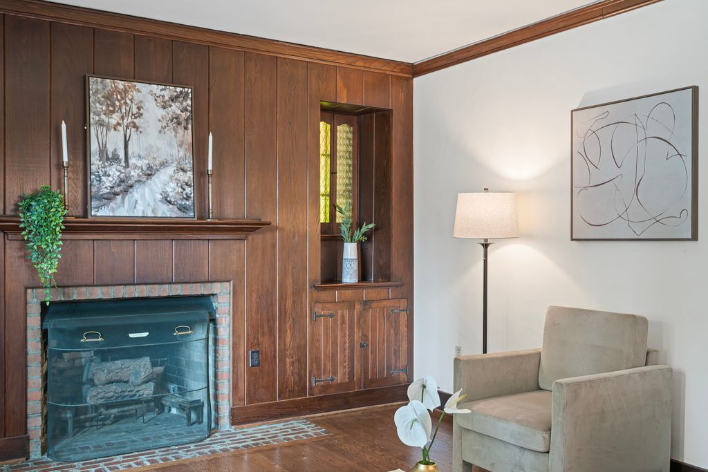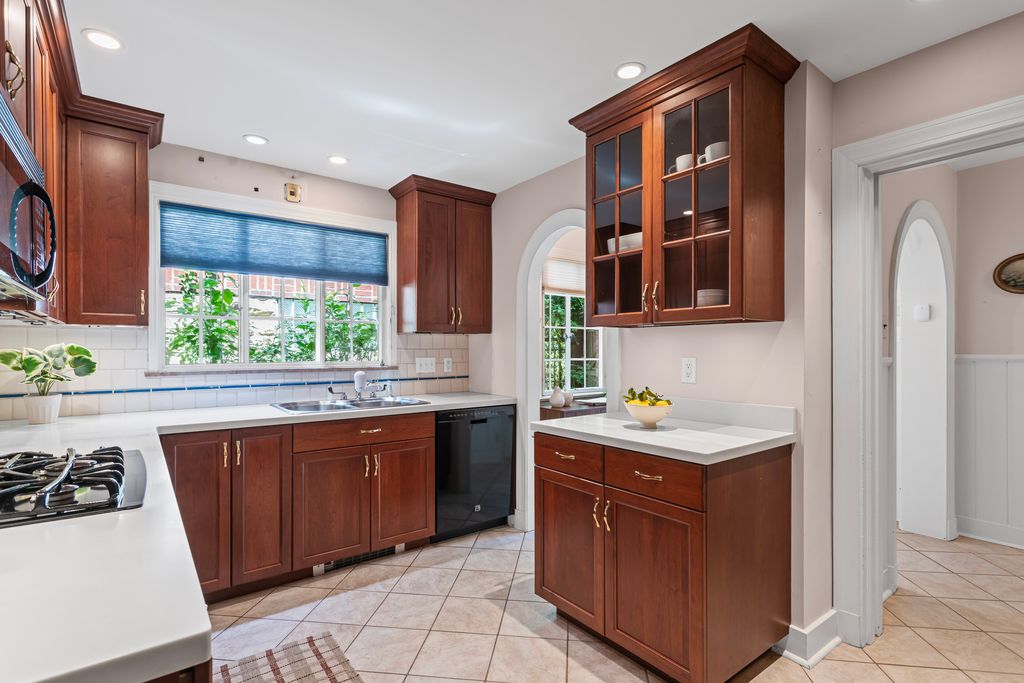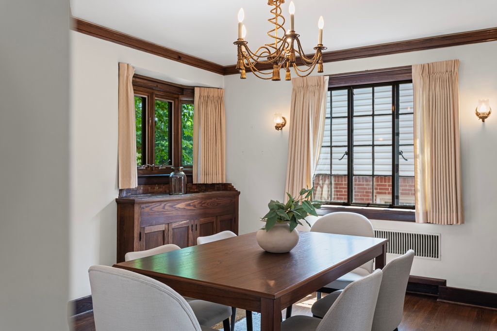 Inside, it’s a home that speaks softly but with presence. Arched wood doorways and curved millwork guide you through rooms filled with natural light and purpose. Hardwood floors stretch beneath your feet, while leaded glass windows and mosaic-tiled details reflect the care of another era. The living room, anchored by a decorative fireplace and built-in bookshelves, opens through French doors to a formal dining room—perfect for gathering, or simply lingering in quiet.