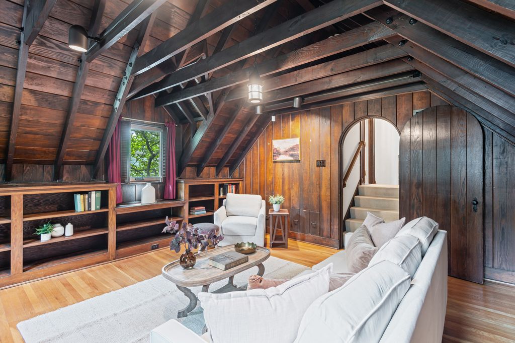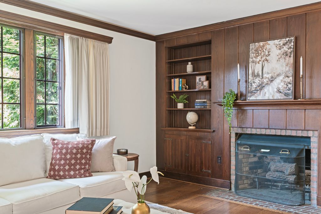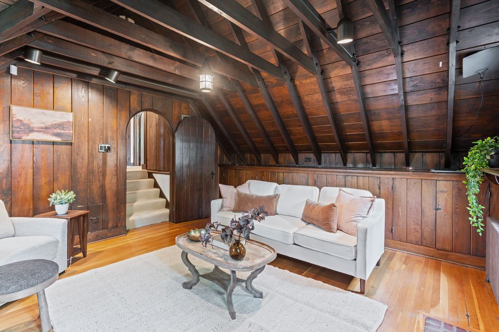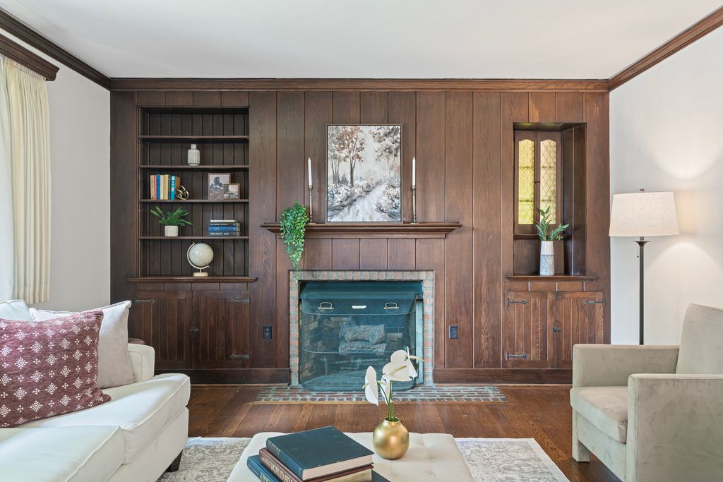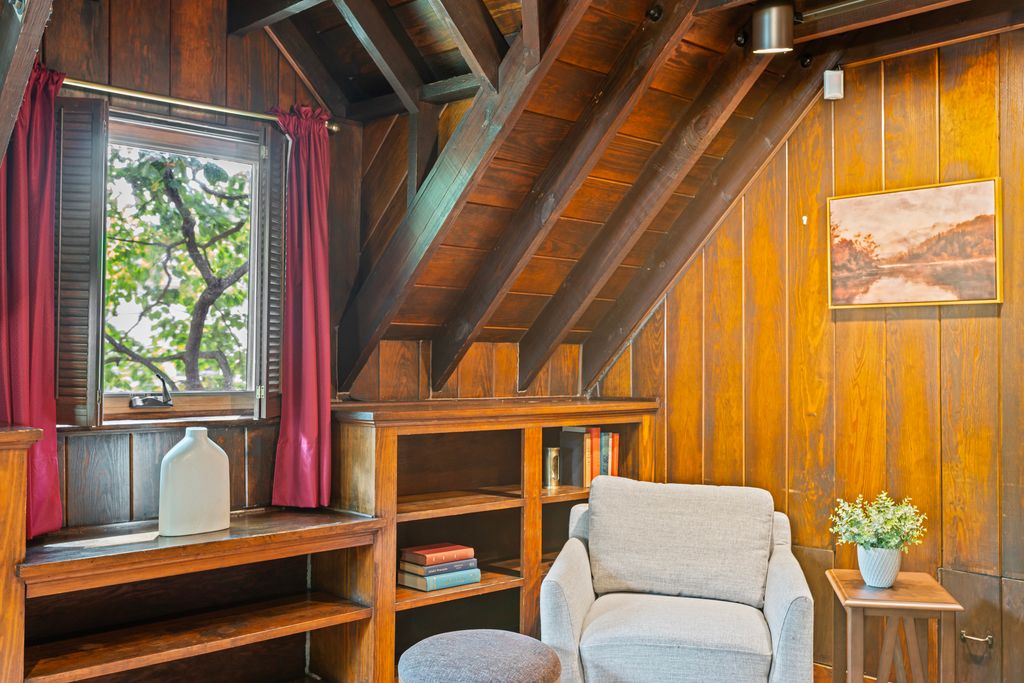 Upstairs, the primary suite is both simple and grand, with gleaming hardwood floors, a handsome decorative fireplace, and a terra cotta-tiled en-suite bath. Two more bedrooms offer space for family or guests, but the second-floor study is something altogether different. Lined with built-in bookshelves and cloaked in dark wood paneling beneath arched, beamed ceilings, it feels like a scene from an old novel—complete with a cozy fireplace and a hushed stillness that invites imagination.