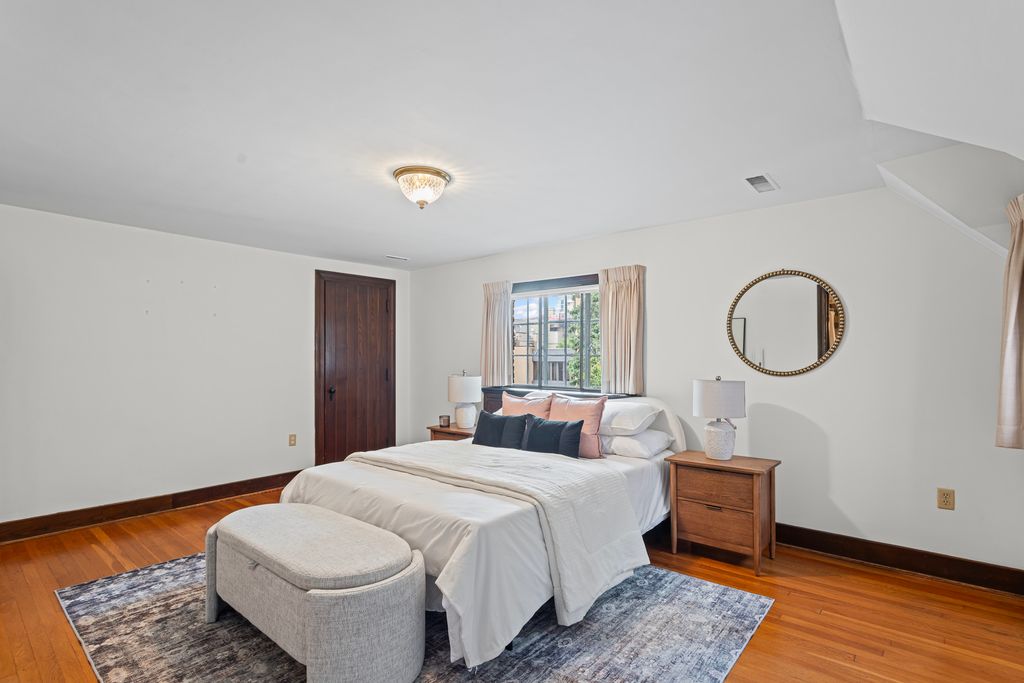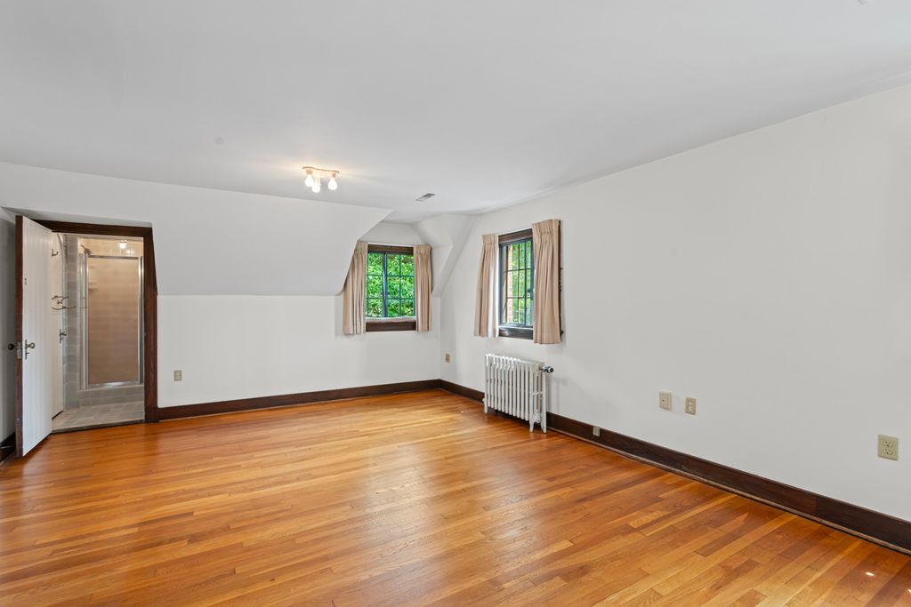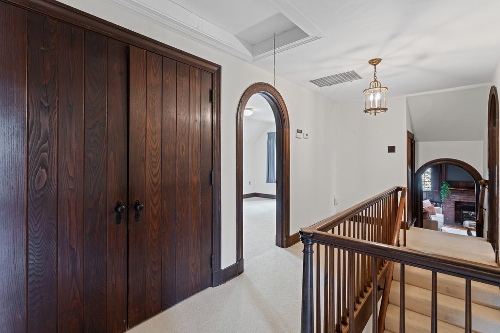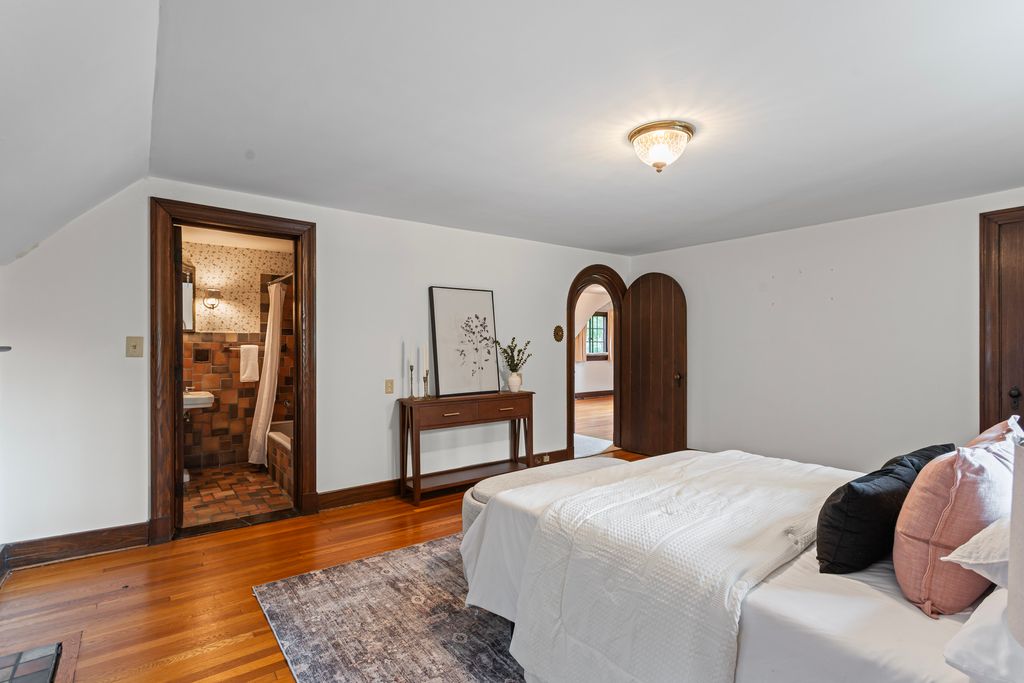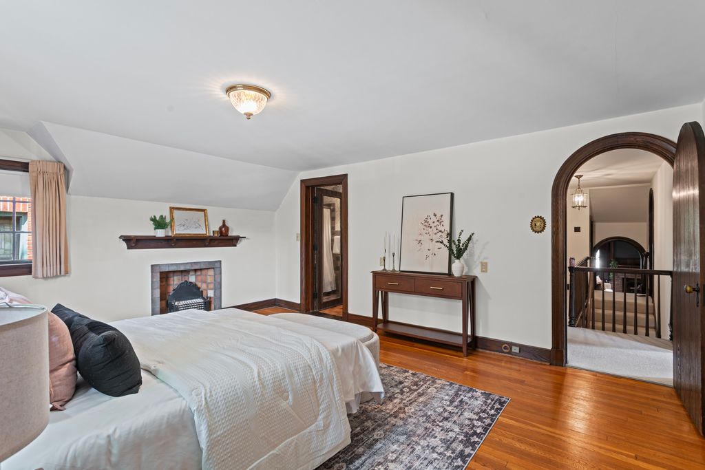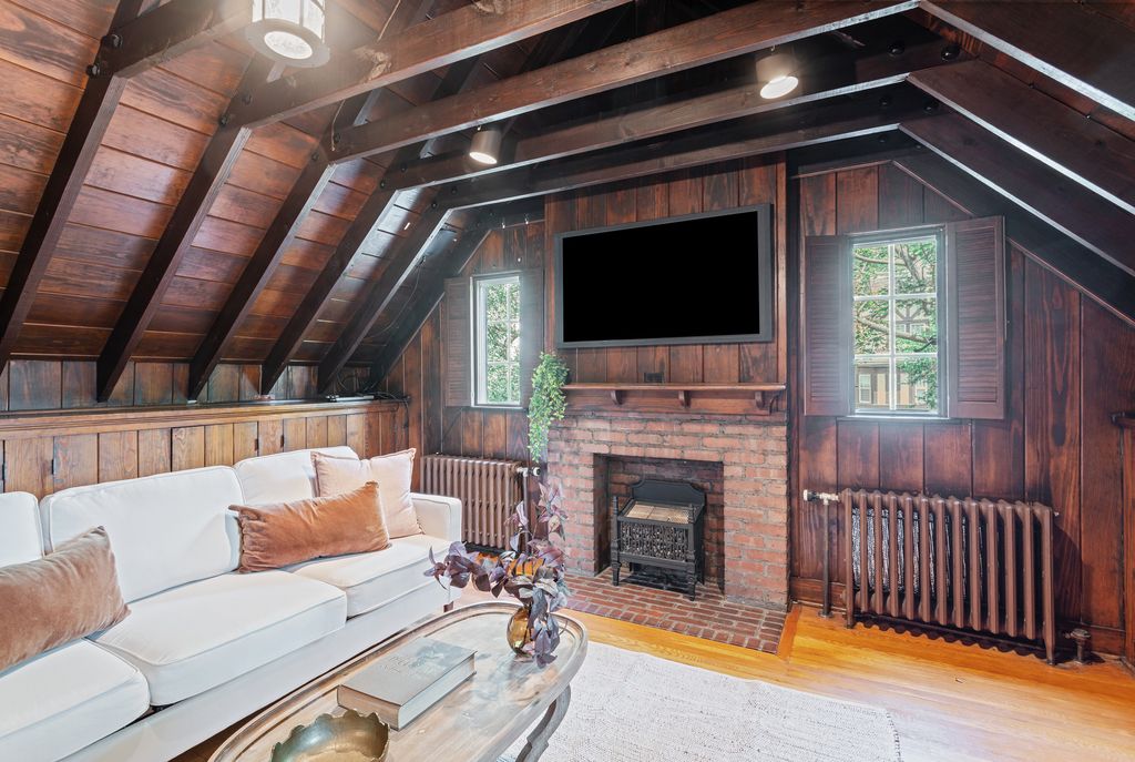 Upstairs, the primary suite is both simple and grand, with gleaming hardwood floors, a handsome decorative fireplace, and a terra cotta-tiled en-suite bath. Two more bedrooms offer space for family or guests, but the second-floor study is something altogether different. Lined with built-in bookshelves and cloaked in dark wood paneling beneath arched, beamed ceilings, it feels like a scene from an old novel—complete with a cozy fireplace and a hushed stillness that invites imagination.