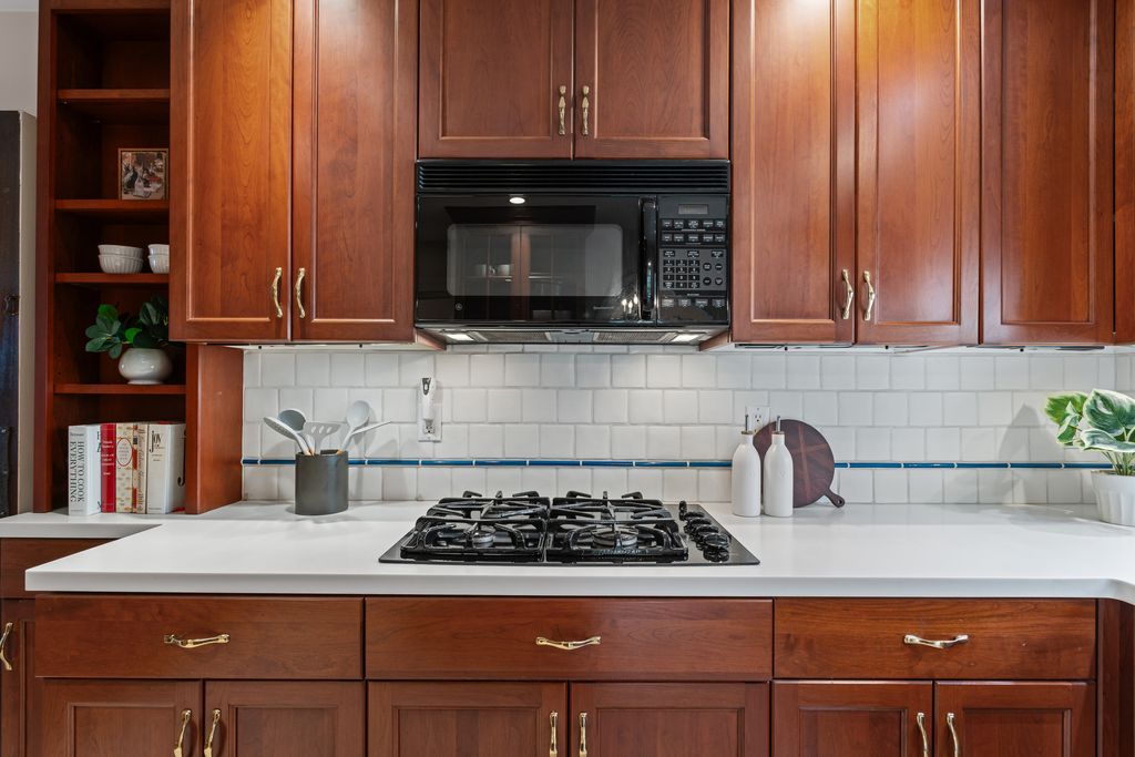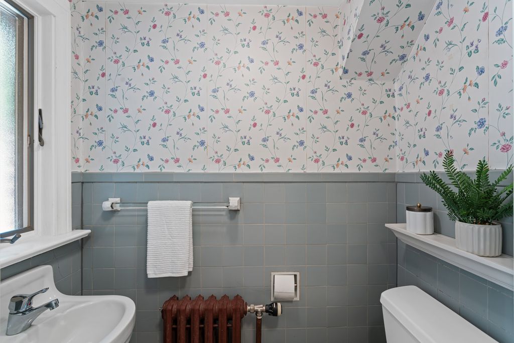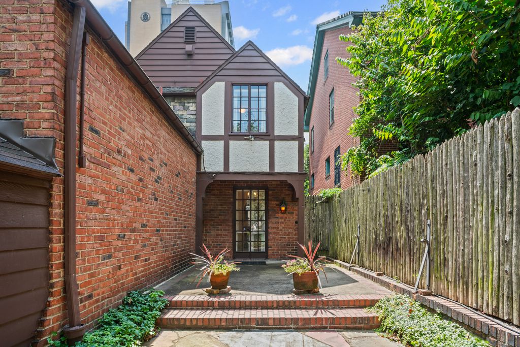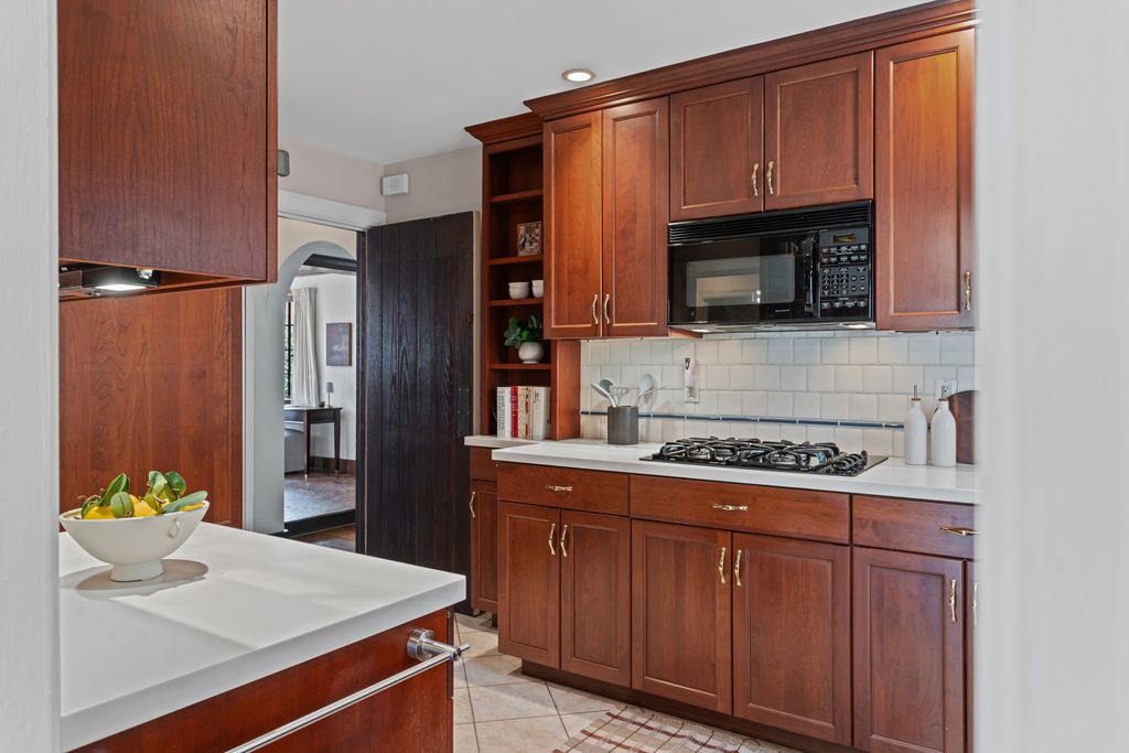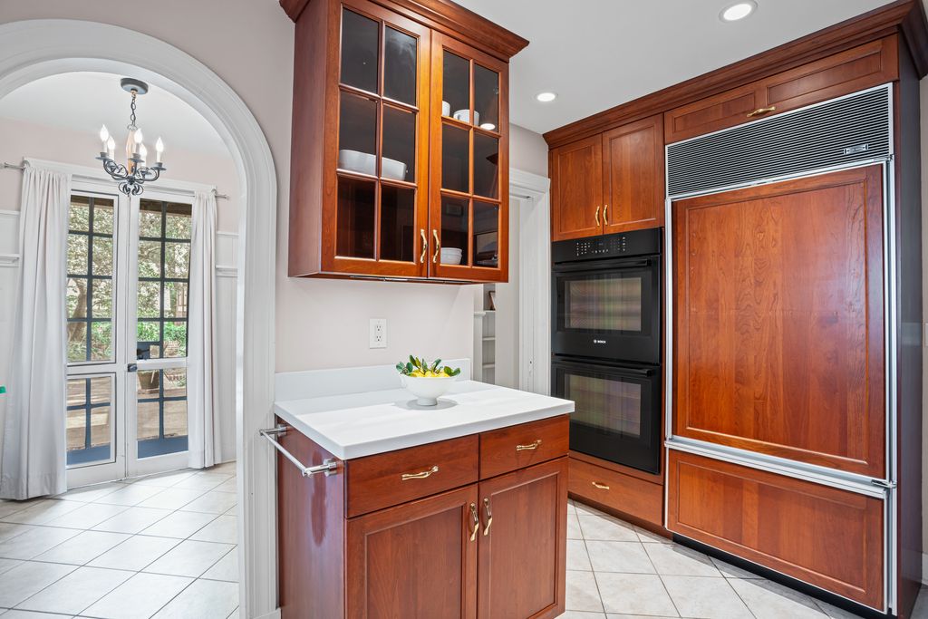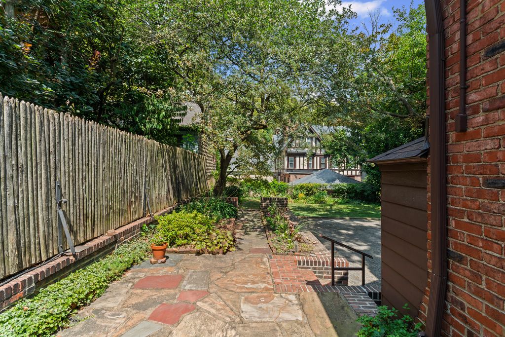 The kitchen has been updated with intention: custom wood cabinetry and paneled appliances blend seamlessly into the home’s story, while bright countertops and a cheerful breakfast nook bring lightness and ease. Through another set of French doors, a flagstone patio and terraced garden wait—tucked under mature trees, private, and inviting.